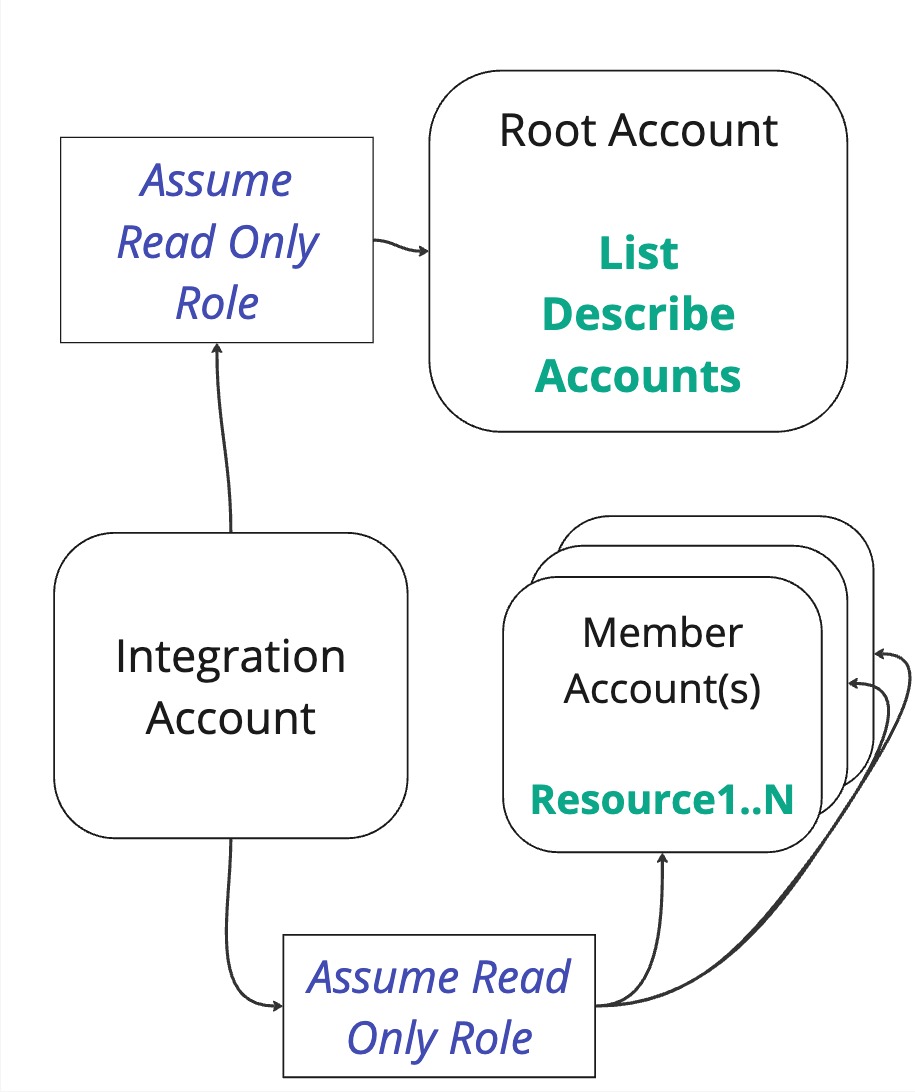 If we look back at the flow from the single account, we see that it's basically the same, just with several member accounts that the integration role has the possibility to assumeRole