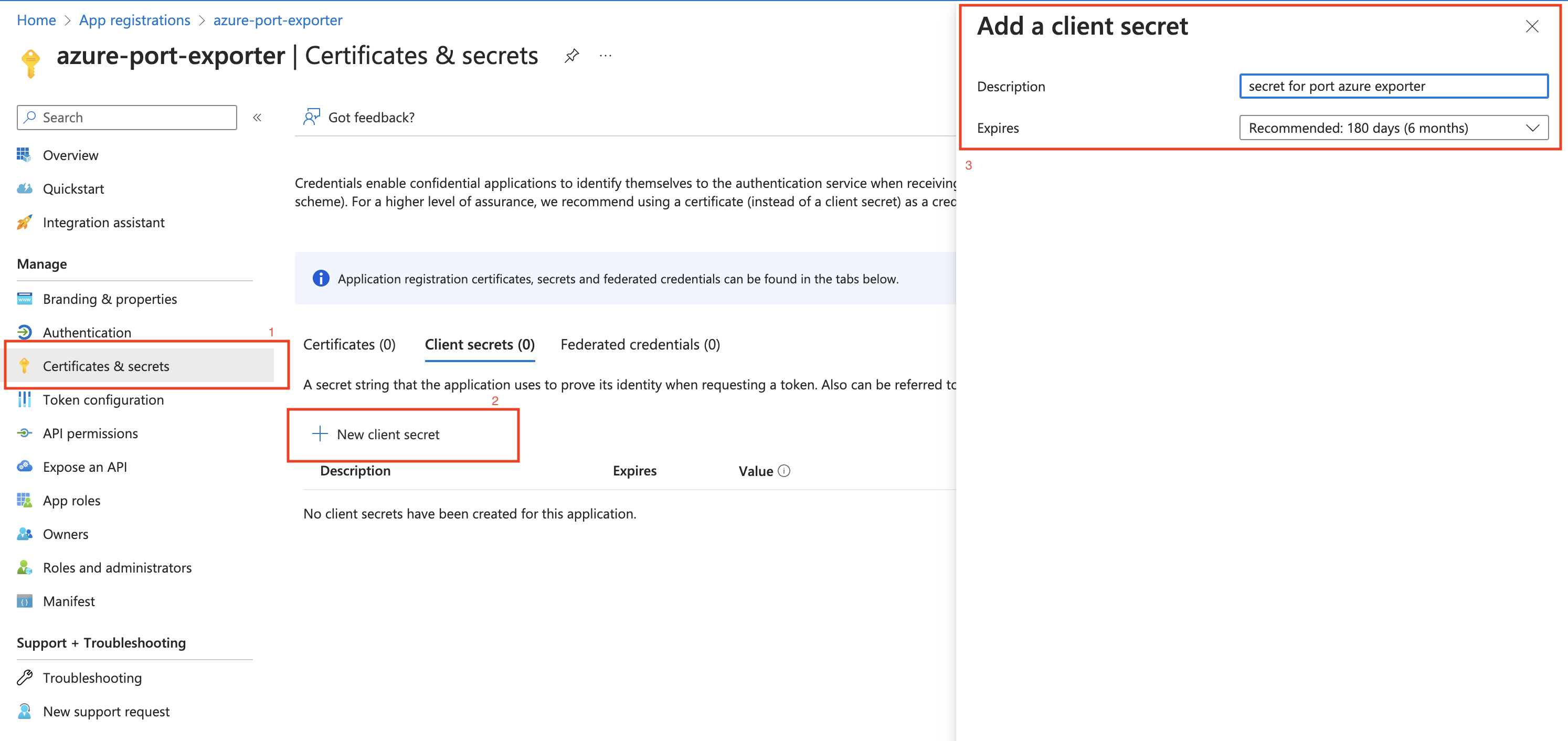- Create a client secret for the App Registration.