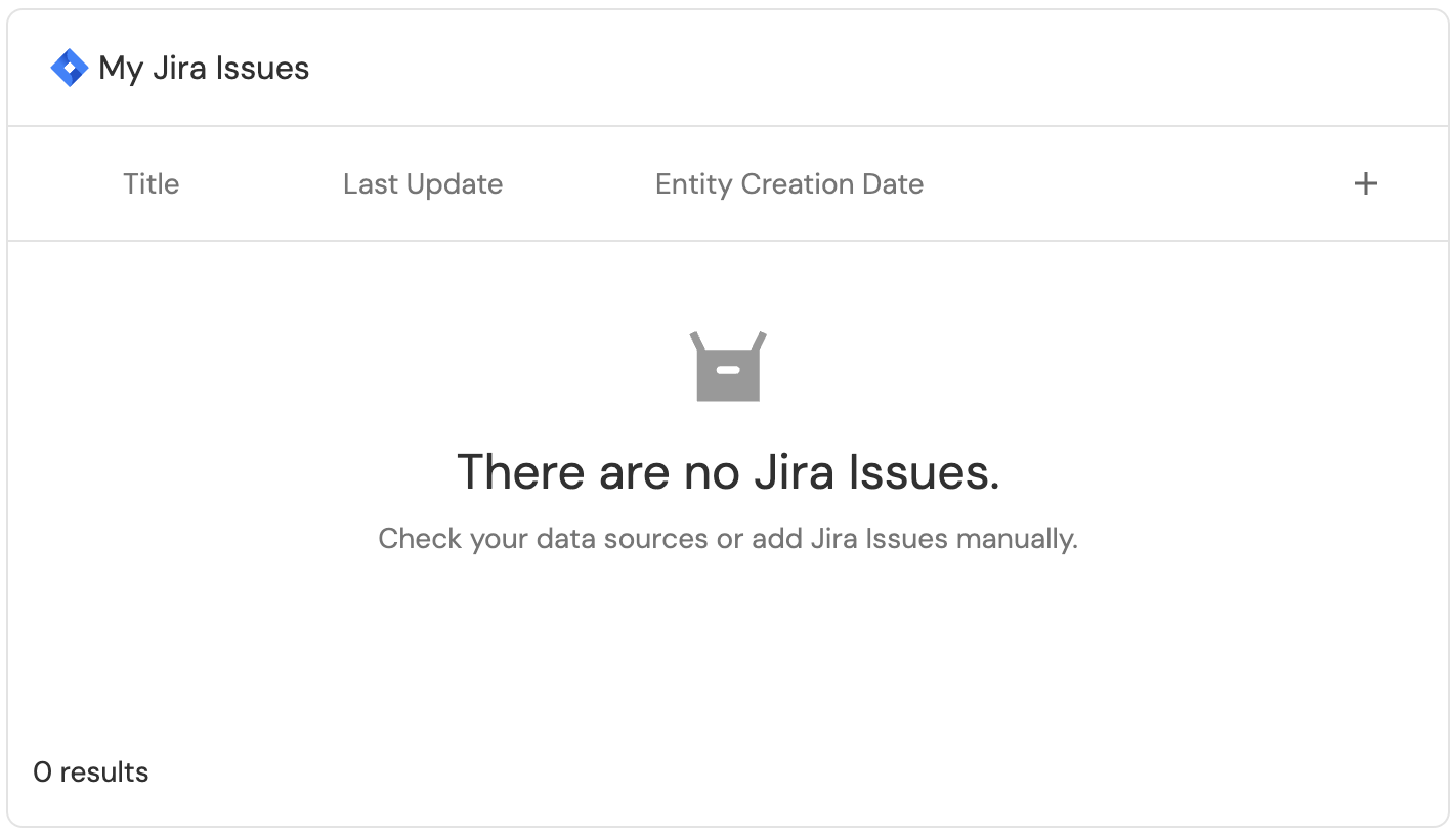 This table will be found in the "Plan my day" dashboard in your portal.Since you have not yet connected your Jira organization to Port, the widget will be empty.