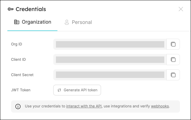 • To get your Port credentials, go to your Port application, click on the ... button in the top right corner, and select Credentials. Here you can view and copy your CLIENT_ID and CLIENT_SECRET: