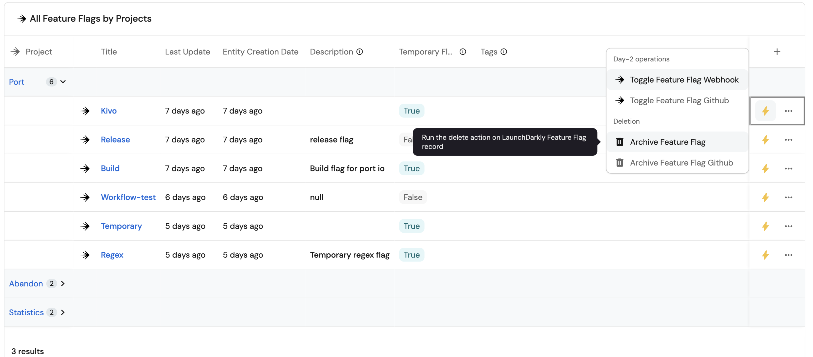 • Build dashboards in Port to monitor and take action on your feature flag resources.