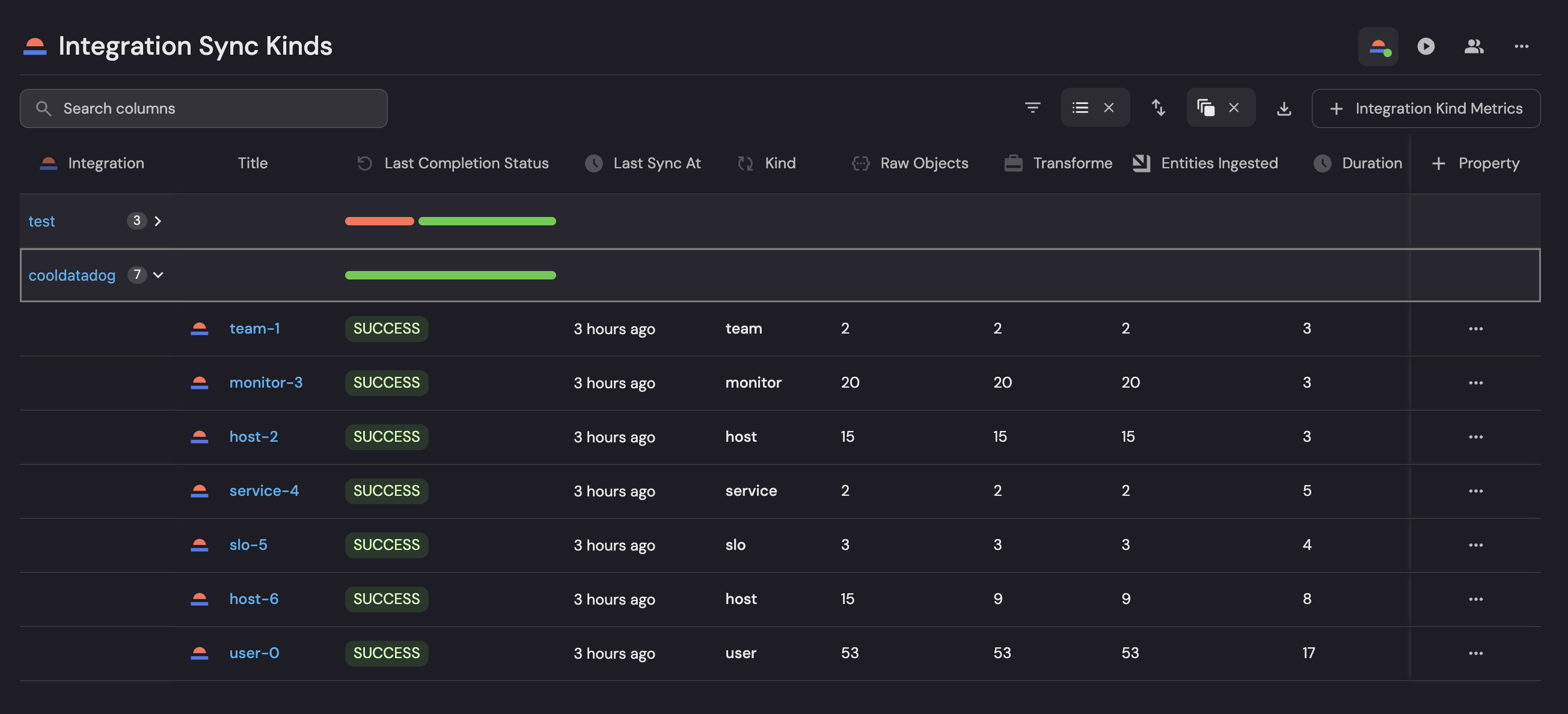 The Integration Kind Metrics blueprint tracks detailed metrics for specific integration kinds, including raw, transformed, and ingested objects.