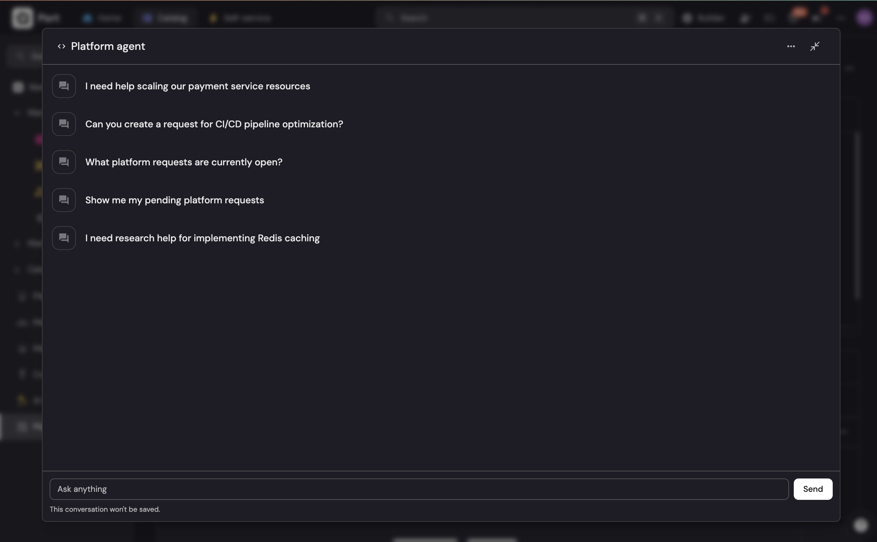 - Automated Request Fulfillment: For common and simple requests, you can enhance the AI agent by allowing it to trigger other self-service actions that fulfill the request automatically, bypassing the manual triage process. For example, if you have an action to scaffold a new service, the agent can trigger it directly for such requests.