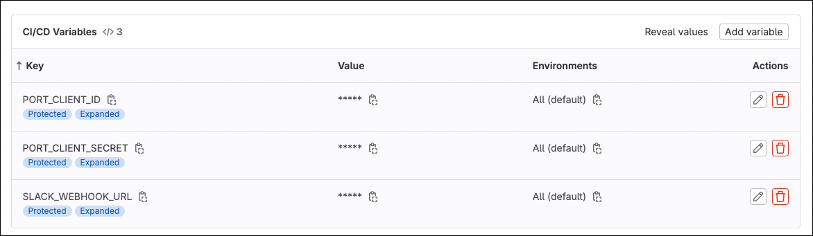 In the GitLab project where your pipeline will reside, create 3 new variables under Settings->CI/CD->Variables