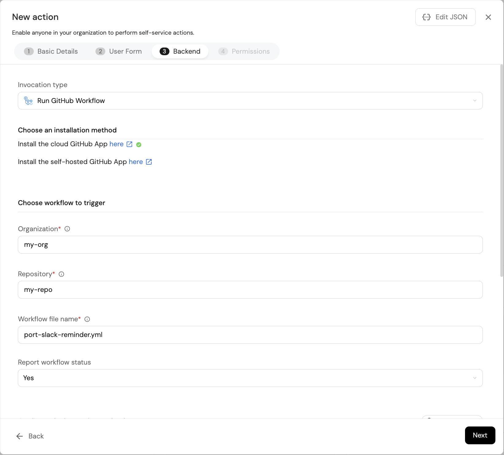 Now we'll define the backend of the action. Port supports multiple invocation types, depending on the Git provider you are using.