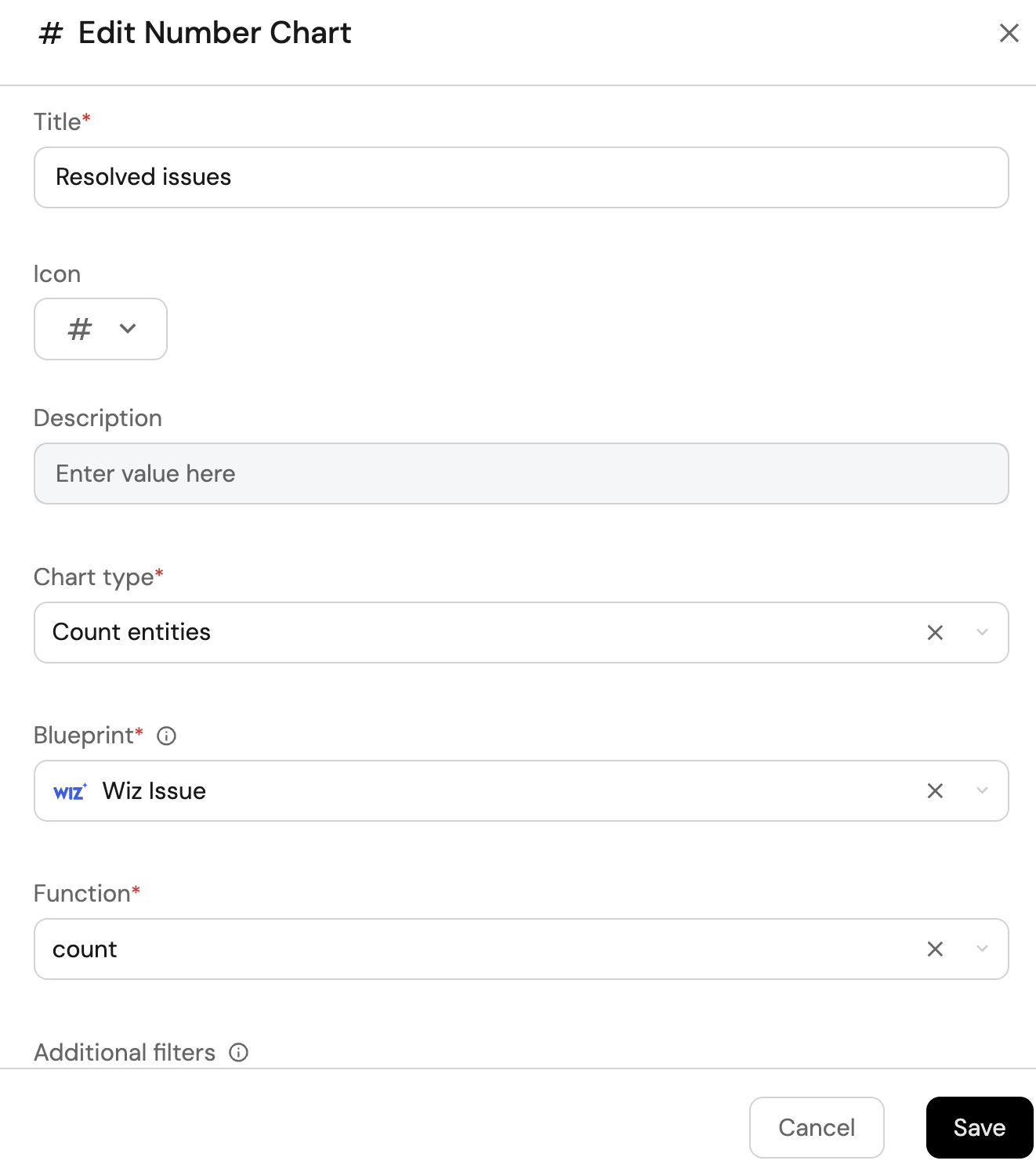 We now have a blank dashboard where we can start adding widgets to visualize insights from the Wiz issues.
